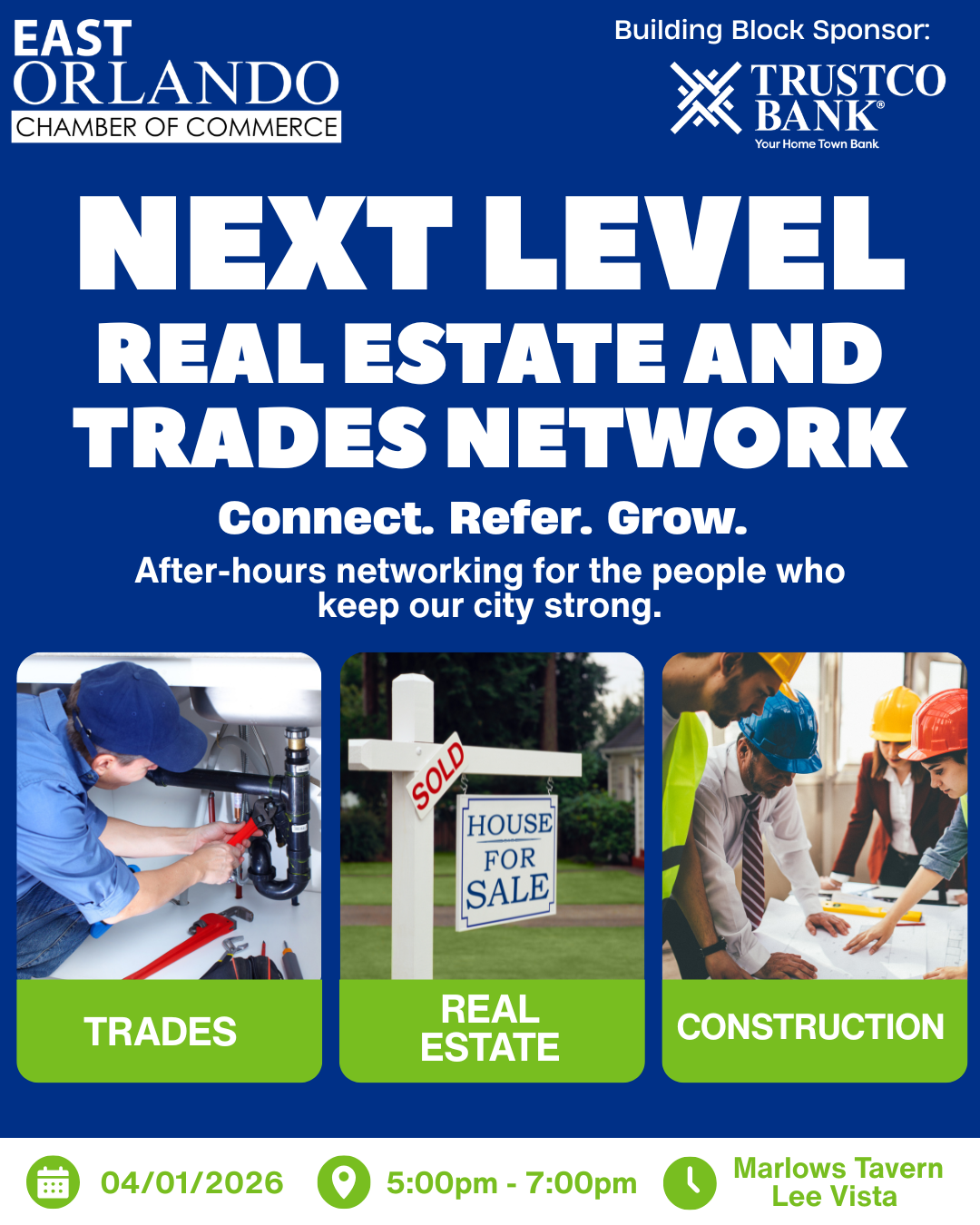 Next Level Real Estate and Trades Network presented by the East Orlando Chamber of Commerce, is dedicated to bringing industry professionals together with valuable referral sources and resources. This event fosters business growth and community development through dynamic networking opportunities, all in a fun, after-hours atmosphere.