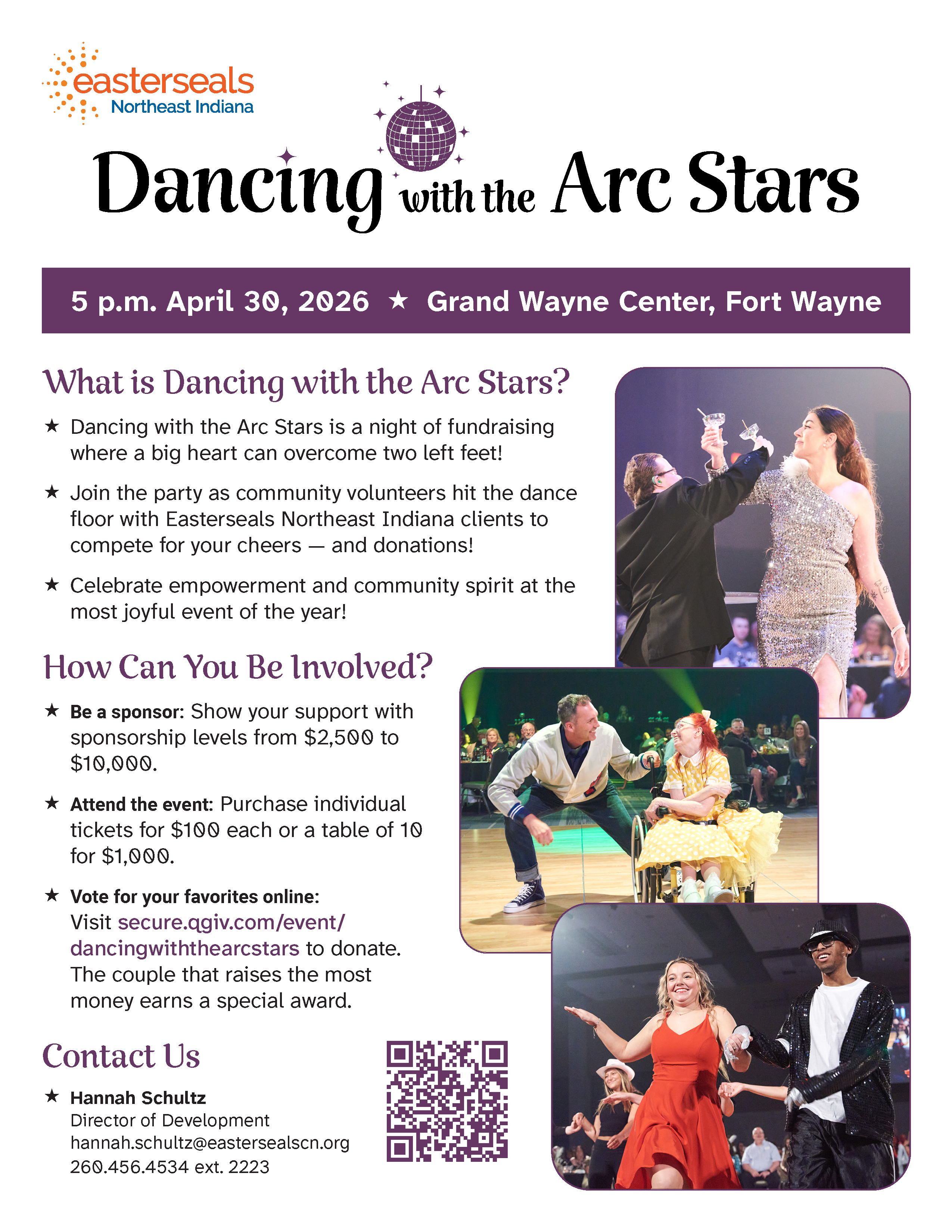 Dancing with the Arc Stars is a night of fundraising where a big heart can overcome two left feet! Join the party as community volunteers hit the dance floor with Easterseals Northeast Indiana clients to compete for your cheers - and donations!