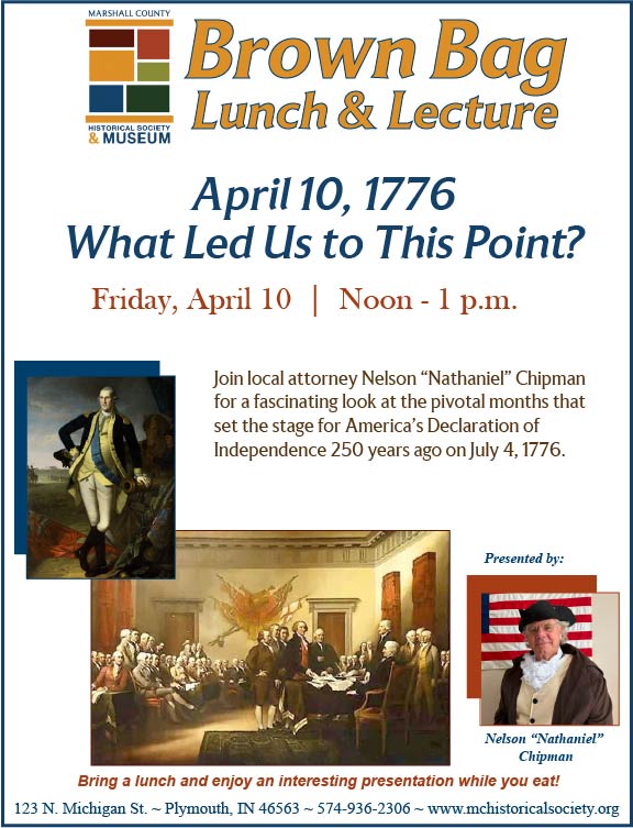 The event will be held at the Marshall County Historical Society & Museum, 123 N. Michigan St., Plymouth. Pack a lunch and learn with us! For more information, please call 574-936-2306.
