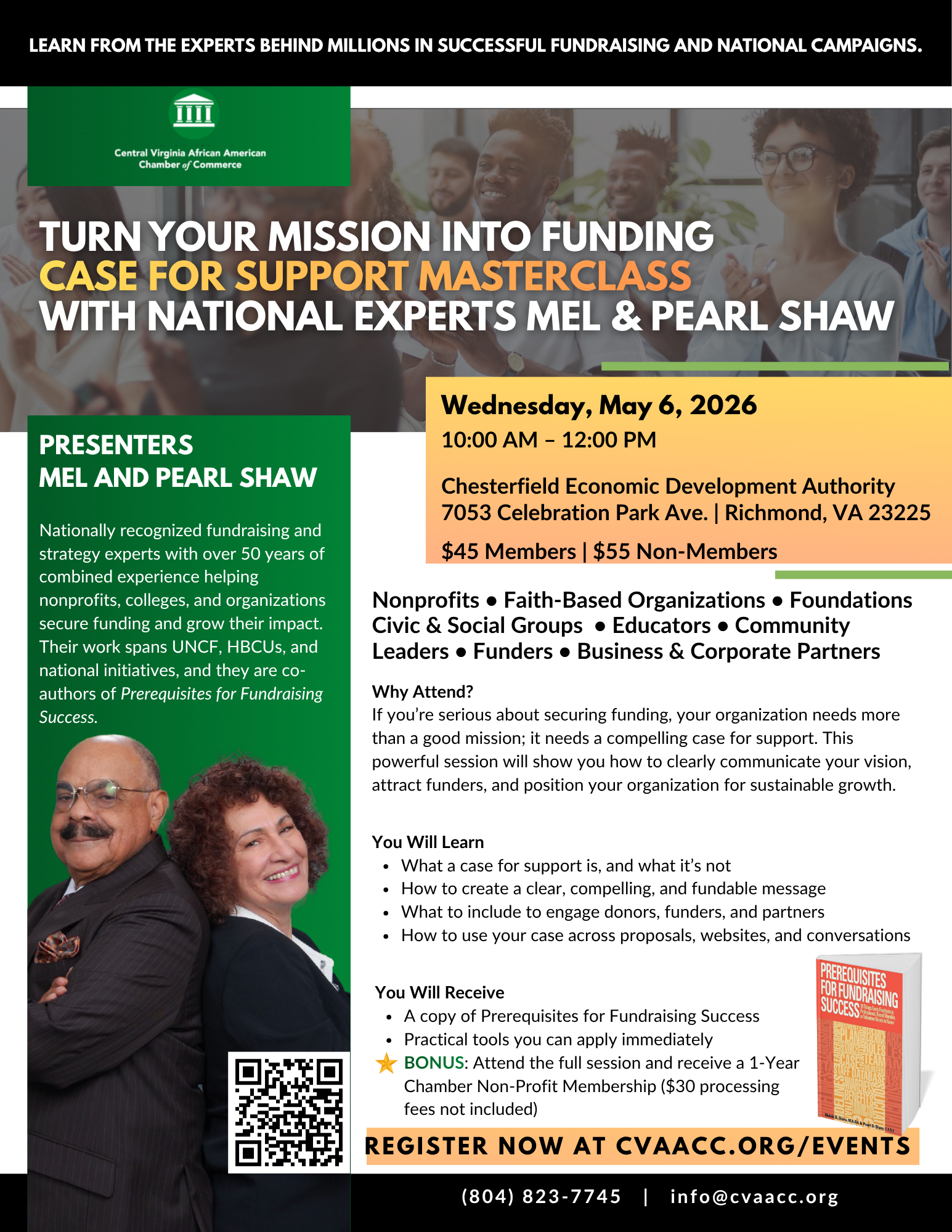 Mel & Pearl Shaw are nationally recognized fundraising and strategy experts with over 50 years of combined experience helping nonprofits, colleges, and organizations secure funding and grow their impact. Their work spans UNCF, HBCUs, and national initiatives, and they are co-authors of Prerequisites for Fundraising Success.