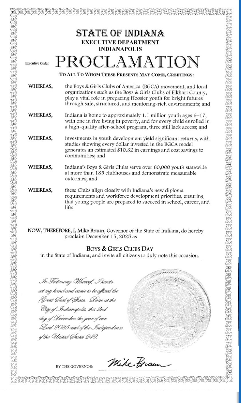 Indiana Declares December 15 as Boys & Girls Clubs DayGovernor Mike Braun has officially proclaimed December 15, 2025, as Boys & Girls Clubs Day in the State of Indiana, recognizing the essential role that Clubs play in preparing Hoosier youth for bright futures through safe, structured, and mentoring-rich environments. This proclamation honors the statewide Boys & Girls Clubs movement, including 30 local organizations serving well over 180,000 youth across more than 185 clubhouse locations.Indiana has a significant youth population, with 1.1 million youth ages 6–17, and one in five living in poverty. For every child enrolled in a high-quality after school program, three more still lack access. Investments in youth development yield substantial returns, generating an estimated $10.32 in earnings and cost savings to communities for every dollar invested in the Boys & Girls Clubs model. To mark Boys & Girls Clubs Day, Indiana’s Clubs will participate in a coordinated social media celebration on December 15, sharing stories of impact, statewide campaign materials, and encouraging Hoosiers to support their local Clubs. “We are deeply indebted to our Indiana leaders, and Governor Braun, for their long-term support of Boys & Girls Clubs, and for prioritizing Hoosier youth. It is because of active partners like Governor Braun that we can make such an impact statewide.” – Matt Watrous, Government Relations, Boys & Girls Clubs of America Indiana’s Boys & Girls Clubs align closely with the state’s new diploma requirements and workforce development priorities, ensuring young people are prepared to succeed in school, career, and life. The statewide network provides academic support, mentorship, health and wellness programming, leadership opportunities, and safe spaces that foster belonging and resilience. Locally, Boys & Girls Clubs of Marshall County is proud to join in this celebration, sharing the impact of our programs and the stories of youth we serve every day. To participate, Hoosiers are encouraged to follow their local Club on social media, share their own Club stories, and support the vital work taking place in communities across Indiana. Submitted: 12/12/25 Article By: Boys & Girls Club of Marshall County, Inc. |
